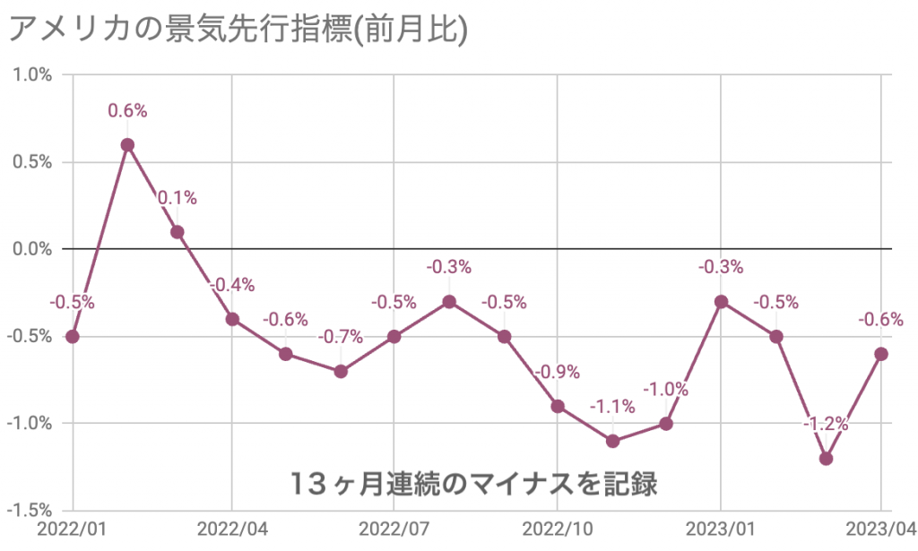 - 景気先行指数はマイナスになると景気見通しが悪いことを意味するが、これで13ヶ月連続でマイナスを記録した。