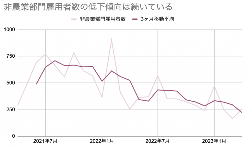 - 4月は力強い結果になったが、2月や3月のデータは下方修正された。雇用が緩やかに弱まっている傾向はまだ続いている。