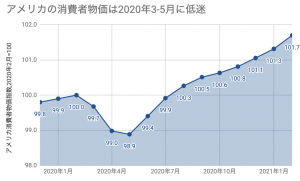 インフレ率が大きく伸びる理由は「前年の物価がコロナの不況で低迷していたため、前年比で大きな数字が出やすいから」、「アメリカ政府の給付金が3月後半から4月にかけて配られるから」の2点です。