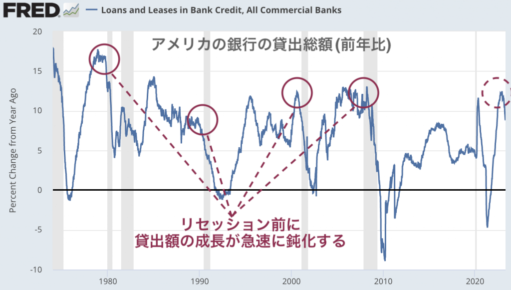- リセッションが来る前にはアメリカの銀行の貸出額が減る動きが見られるが、既にその兆候が見られている。