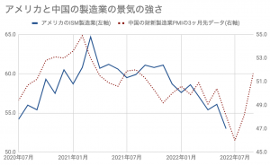 そして、近年のISM製造業指数の傾向ですが、中国の製造業の景気に約3ヶ月ほど遅れて同じような動きをしています。
